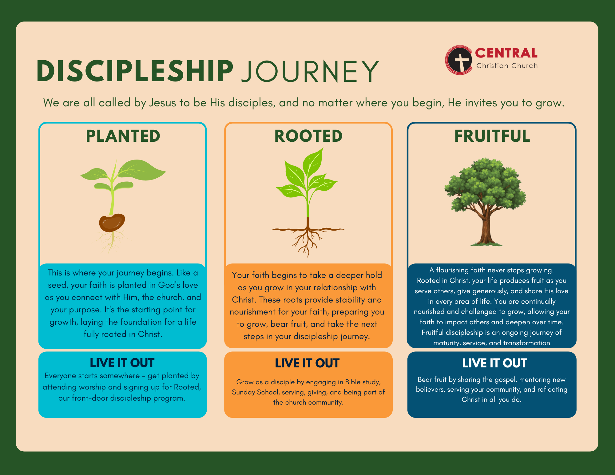 At Central, we believe everyone's faith journey looks different-and that's completely okay. Our steps of Discipleship help guide you wherever you are in your walk with Christ.